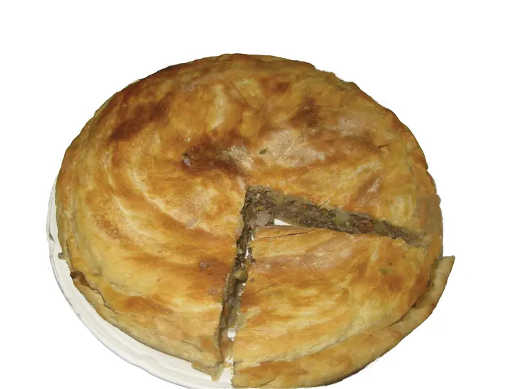 Tsikan is the ancient meal of the Lezgi people. It is known to be filling and a small amount serves many people. One tsikan can feed a whole family because it contains a lot of ingredients. Tsikan is made of ground meat with a lot of fat. Onions and potatoes are cut into pieces and ground walnuts are added. Then dry thyme, salt, and pepper are added to this. Yeast dough is prepared, buttered, and made into balls. After rising, the two dough balls are rolled out flat. Cooked ground meat is placed on one of the lavashes, it is covered with another one and the sides are fastened. Tsikan can be twofold or threefold, with a layer of dough between each. It is baked in a xerek (traditional oven) or a stove. After it is baked, tsikan is wrapped in a thick tablecloth for 20-25 minutes.
